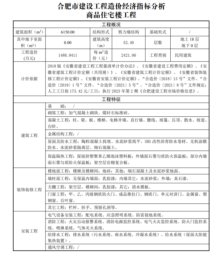 2023年3月合肥市建设工程造价经济指标分析--商品住宅楼工程