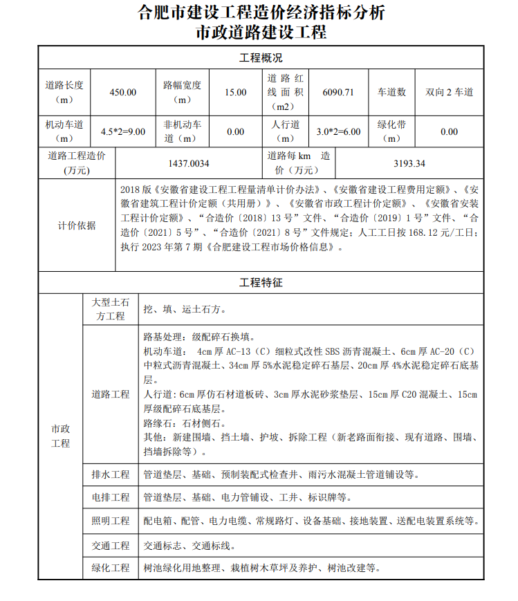 2023年4月合肥市建设工程造价经济指标分析--市政道路建设工程